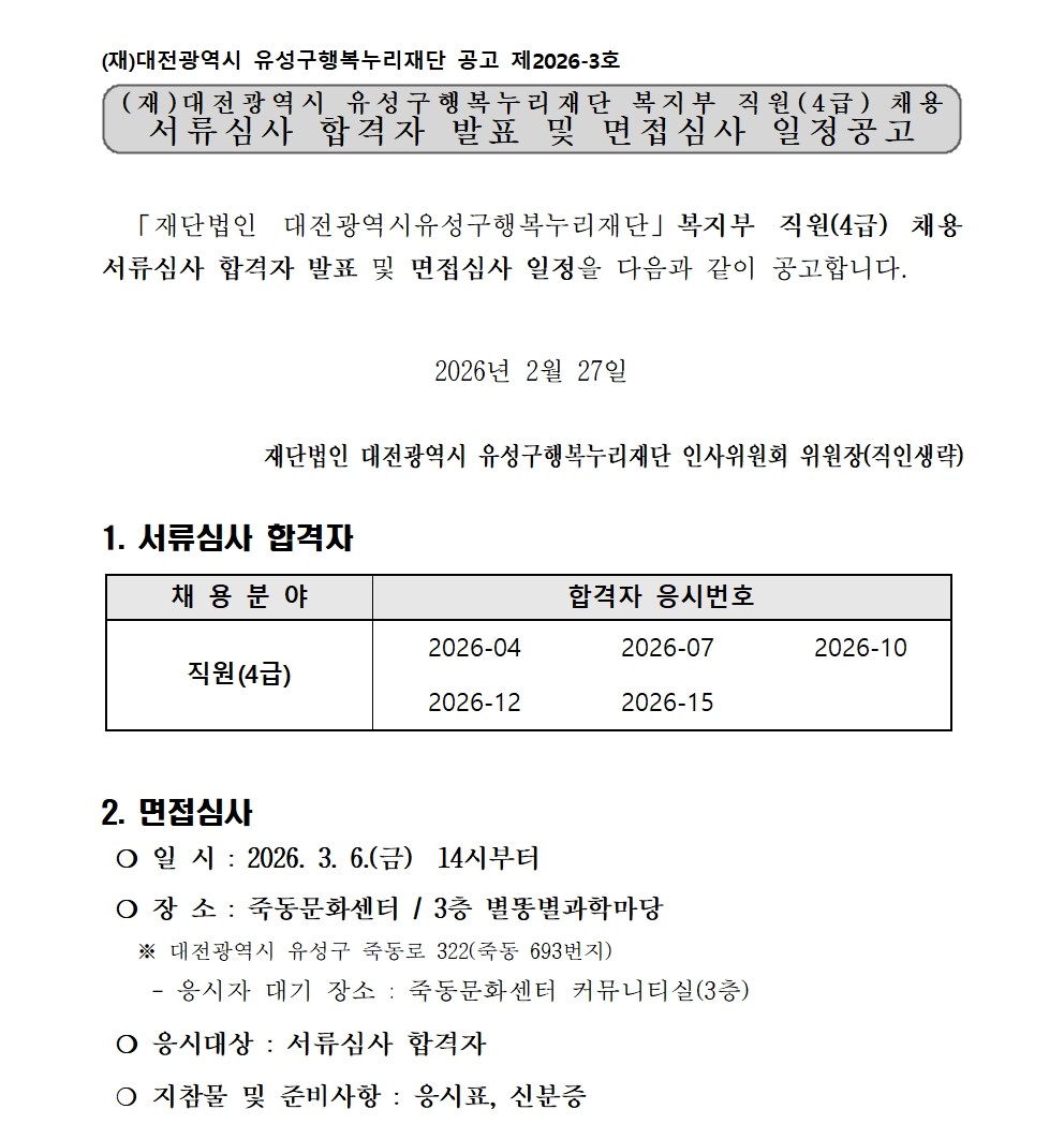 유성구행복누리재단 복지부 직원(4급) 채용 공고