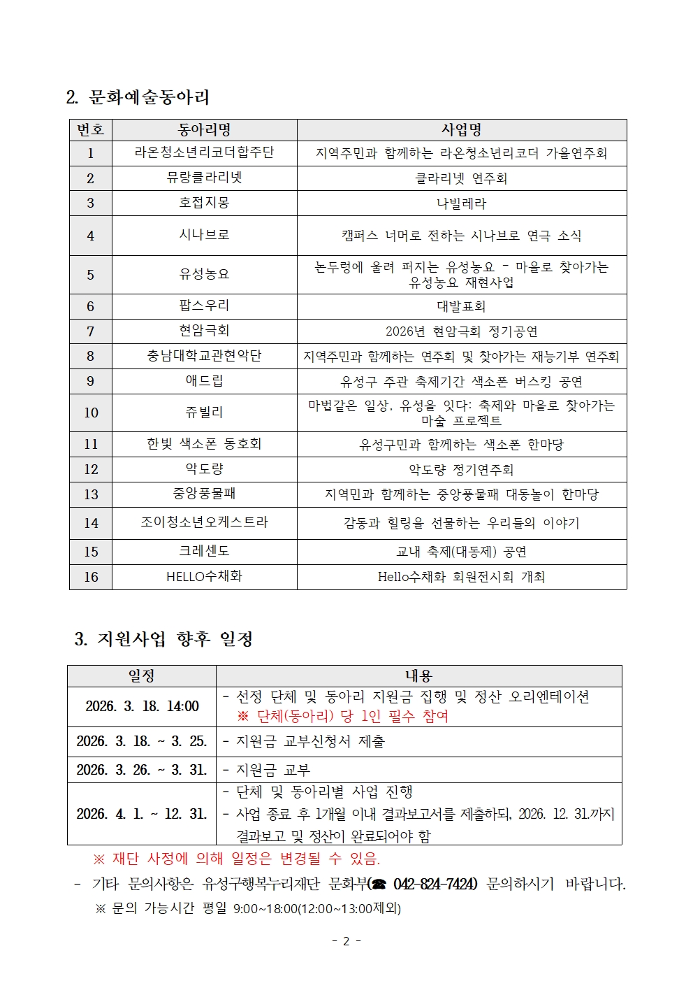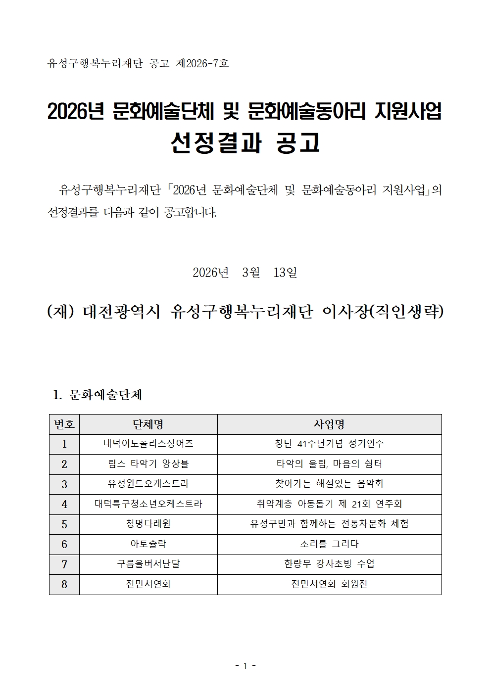 2026년 문화예술단체 및 문화예술동아리 지원사업 선정결과 공고